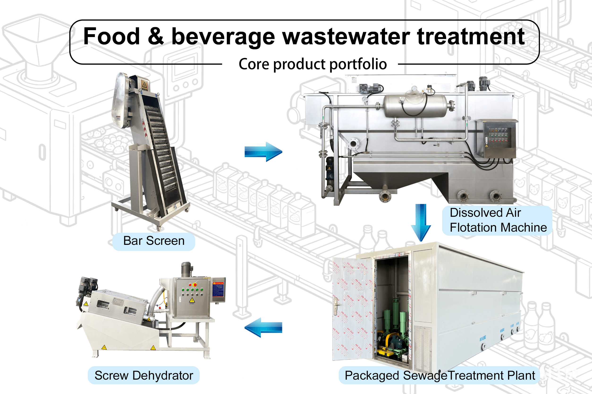 Core product portfolio: Mechanical grille + dissolved air flotation machine + integrated sewage treatment equipment + screw press dewatering machine