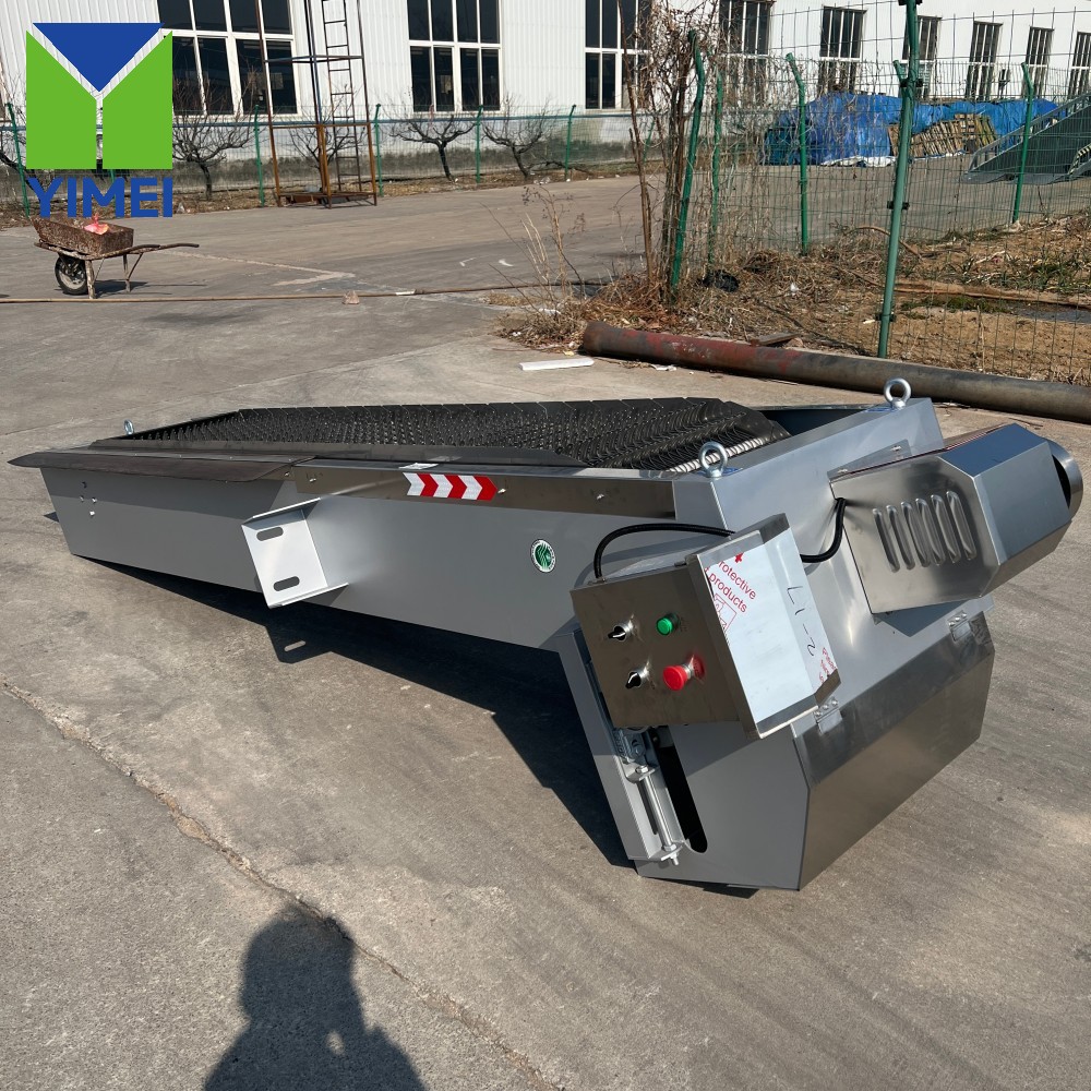 Routine maintenance includes periodic visual inspection of bar spacings and rake teeth, checking and greasing the drive chain, and clearing the discharge hopper area. A complete operation and maintenance manual is provided with the unit.